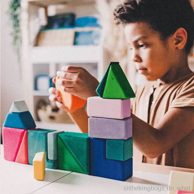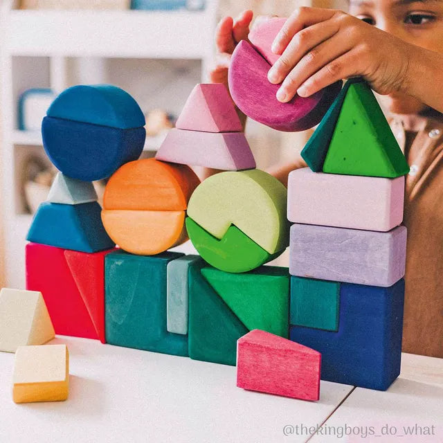 These colourful blocks are for both building and puzzle:Through the geometrical shapes a whole new world is open. Since our blocks are not varnished, they do not fall apart easily when they are being stacked. For children to not only build with but also feel a cube, circle and triangle. Ideal not only for at home but also in school!30 blocks in carton, incl. ideas for playing. Materials: lime wood, non-toxic water based color stain. Size: L= ca. 10cm.