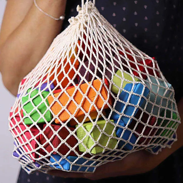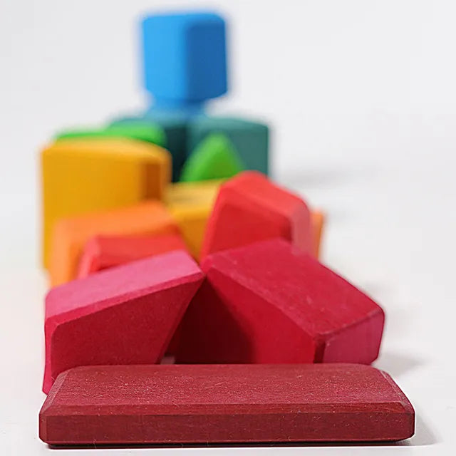 These blocks are ideal for open ended play: Through the irregular shapes of the blocks the children are inspired to use the blocks as car, ship, iron or to build up a landscape. Due to the non-varnished surface, young children are able to stack the blocks easily and the included net bag makes it easy to tidy up. The blocks are sanded down by hand and therefore have no sharp edges or corners. Each of our Waldorf Blocks is unique - shapes and sizes will vary. 15 blocks in net bag. Materials: lime wood, non-toxic water based color stain. Size: ca. 6-8cm.