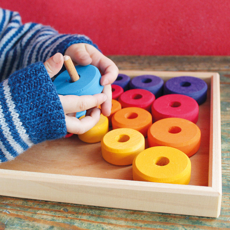 First threading game with discs and with wooden needle for small hands. 19 Pieces.