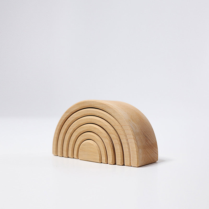 This natural rainbow tunnel is really versatile and ideal already for small children! Toddlers stack, sort and build and as the children get older they will use it as a cradle for dolls, as fence for animals, like a tunnel or bridge for vehicles, as house for dwarfs and dollhouse dolls, build amazing sculptures... this rainbow tunnel will always be integrated in playing with a lot of fantasy. 6 pieces.