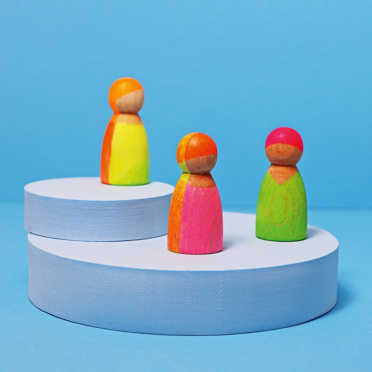 Our Neon Friends shine with full luminosity. They come as part of our Neon Collection in a trio of three different colour variations and are truly eye-catching with their stylish banging outfits! Just like our Rainbow Friends and our Pastel Rainbow Friends, our Neon Friends represent the diversity of people and the uniqueness of each individual. The colourfulness and the grains of the different woods ensure that, on closer inspection, no two figures are alike. The design of our friends is deliberately kept to a minimum, so the imagination of the child can unfold at will, and not be limited by too many predetermined details.