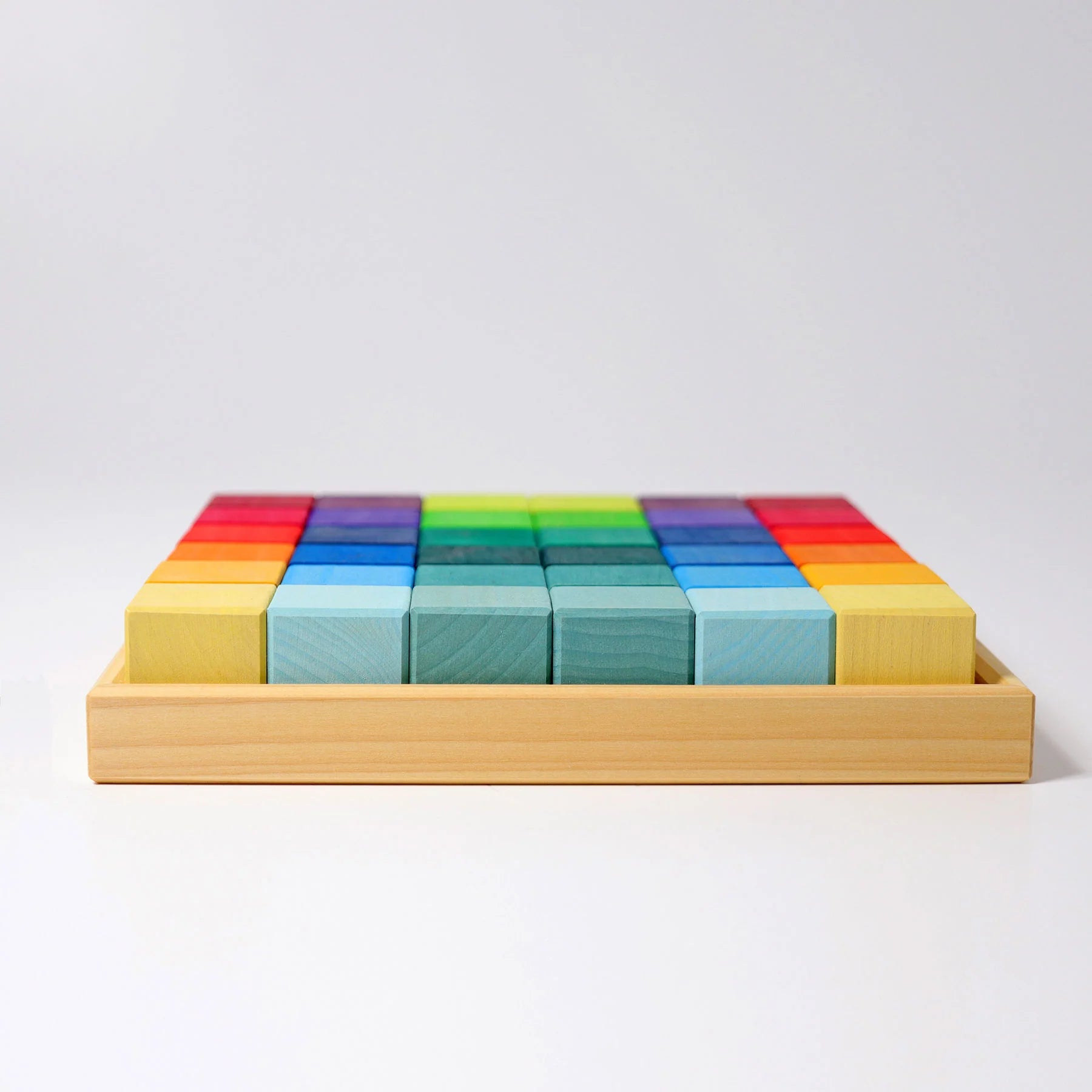 The elemental cubic form of these blocks inspires children to build simple walls, foundations, fences, stalls as well as houses, towers and castles. The basic shape is also very useful for making tables and stools. By building and playing with these blocks, children develop fine motor skills and spatial thinking skills. 36 building blocks in a wooden frame. Materials: lime wood, non-toxic water based color stain/non-toxic plant based oil finish.