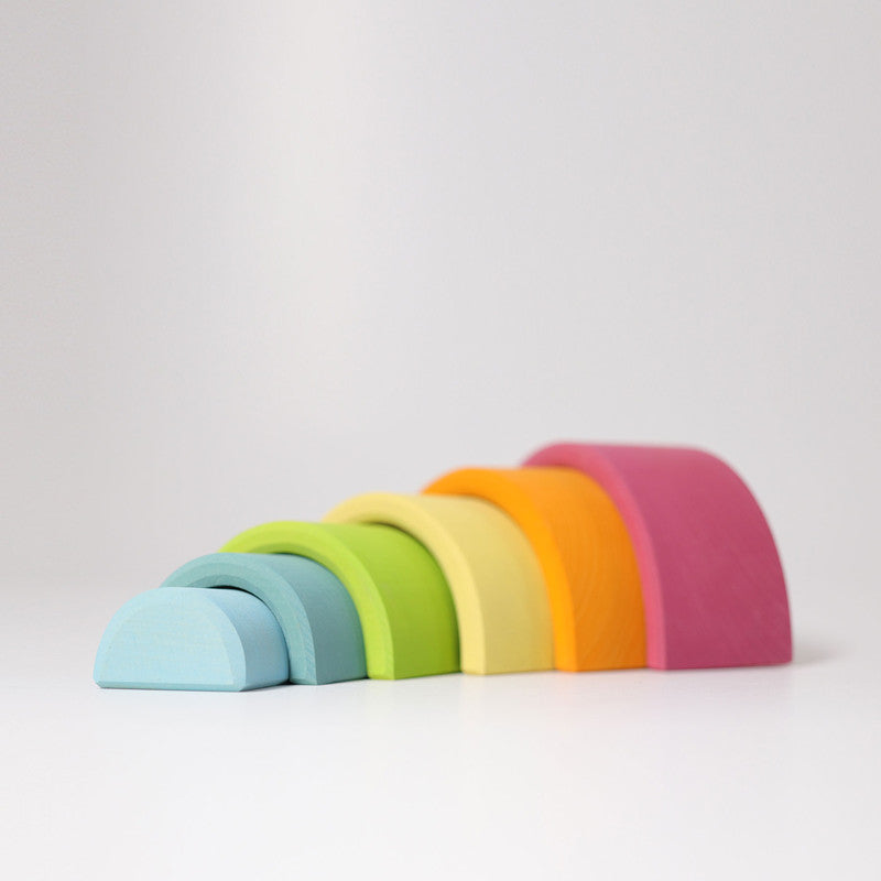 This Rainbow tunnel is really versatile and ideal already for small children! Toddlers stack, sort and build and as the children get older they will use it as a cradle for dolls, as fence for animals, like a tunnel or bridge for vehicles, as house for dwarfs and dollhouse dolls, build amazing sculptures... this rainbow will always be integrated in playing with a lot of fantasy. Perfect to combine with wooden balls pastel colors. 6 pieces.