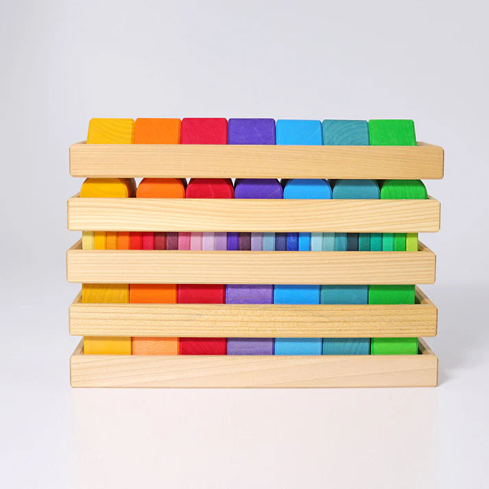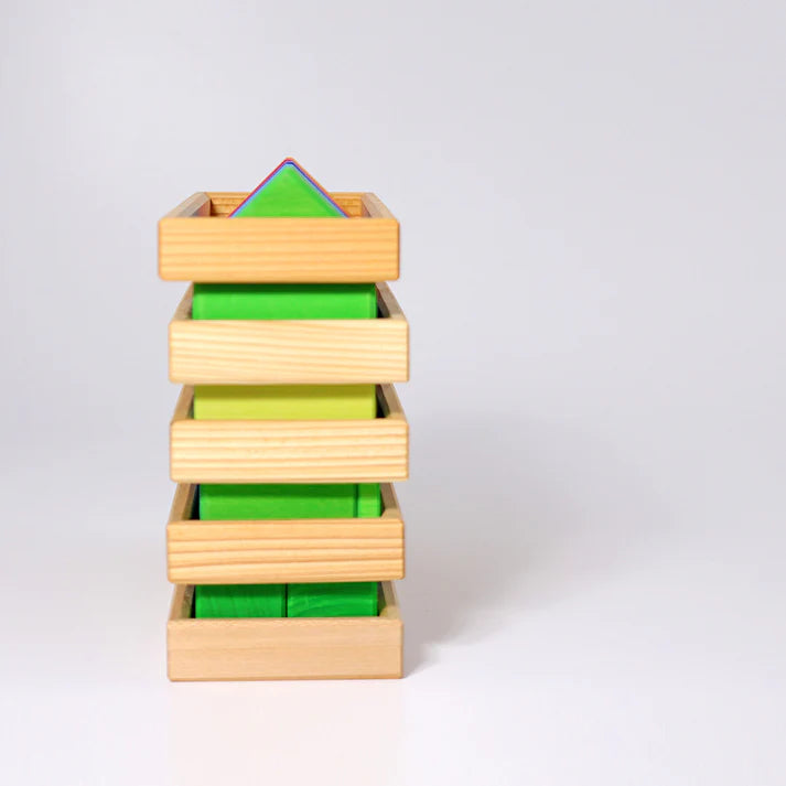 Seven colours and five different geometric forms offer a wide range of colour, coordination and building combinations. Children experience and discover geometric properties through play.Ideal for Kindergarten: For example, each child or group chooses a colour and everyone builds a house until a small colourful city of houses is created. By building and playing with the blocks, children develop fine motor skills and spatial thinking skills. 5 stackable wooden frames with 70 blocks in total in different shapes: triangles, cubes and cuboid, cylinder and plates.