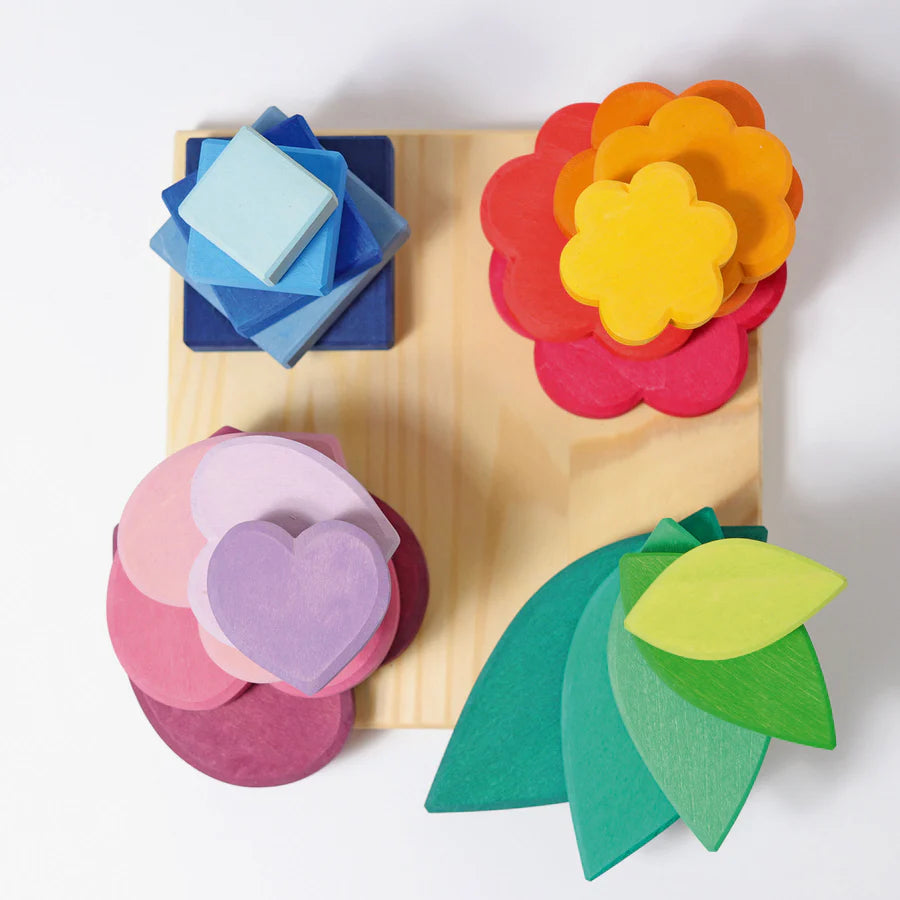 Leave, flower, heart and square: the children can sort and stack forms and colours and build with the discs. While stacking, the eye-hand coordination is stimulated and fine motor skills are trained.
