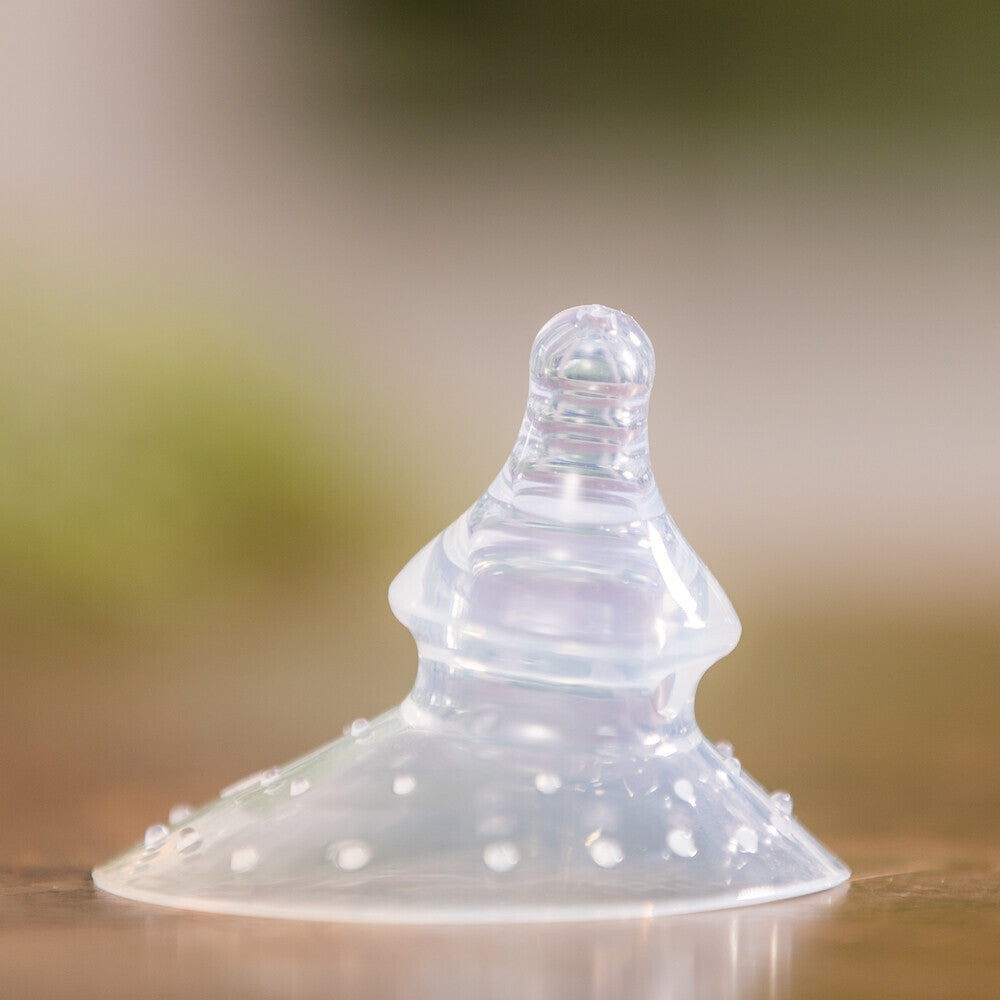 We offer two teat shapes: the orthodontic teat and the nipple teat. The orthodontic teat is thumb-shaped to replicate the shape of a mother's nipple during breastfeeding, making it more readily accepted by breastfed babies. The nipple teat replicates the silicone teat of a baby bottle and is better suited to help your baby transition from breast to bottle.
