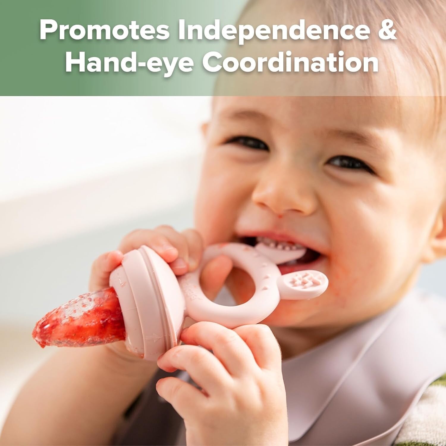 - Soft silicone pouch with small holes that allow only tiny, digestible pieces of food to pass through.