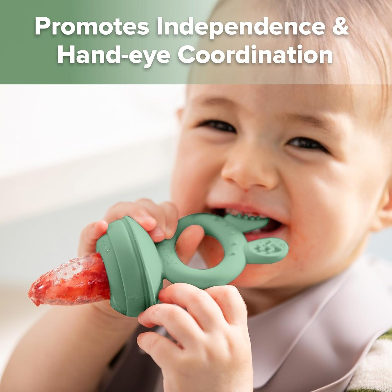 - Soft silicone pouch with small holes that allow only tiny, digestible pieces of food to pass through.