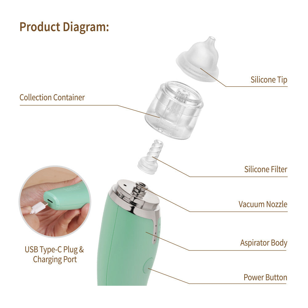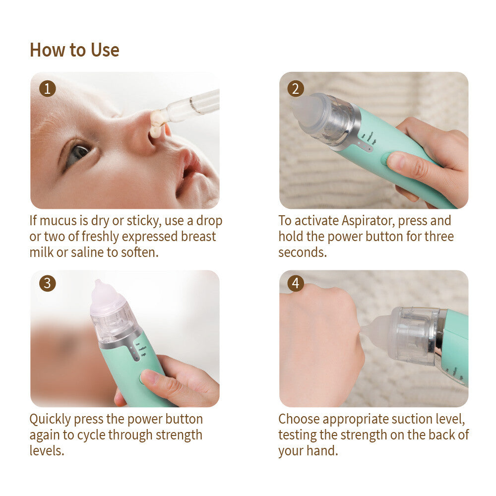 - Three adjustable suction strength levels to gently and effectively clear nasal fluid.