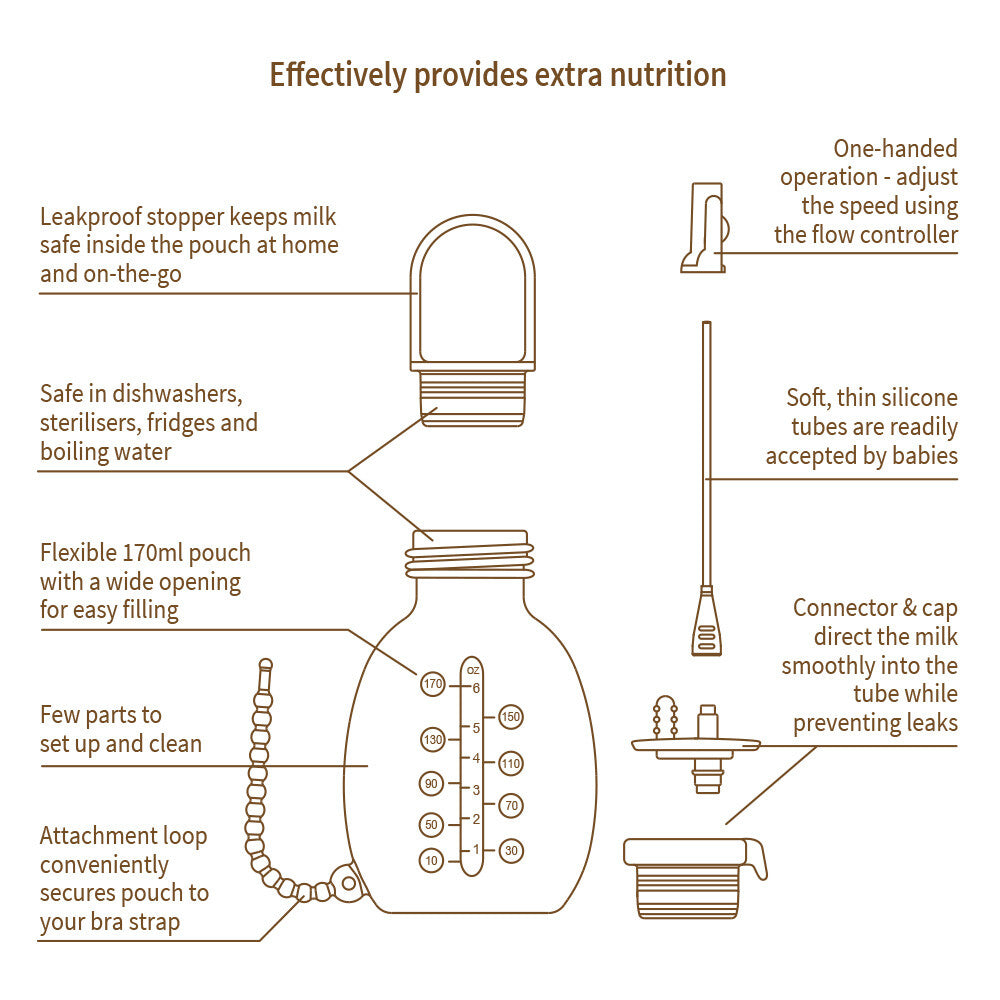 If you and your baby are experiencing feeding issues, including latching or supply concerns, then Haakaa's Supplemental Feeding Tube & Pouch Set is the ideal way to provide extra supplemental milk quickly, easily and safely. The 170ml pouch and tube are made of non-toxic 100% food-grade silicone, and the wide pouch opening makes it easy to fill and clean. The pouch even includes a convenient attachment foop to keep it secure during feeding time, while the one-handed flow controller allows you to adjust the milk flow to suit your baby's needs. This set also includes medical tape to secure the tube to your breast and a handy storage case to keep all the smaller parts neatly tidied away!