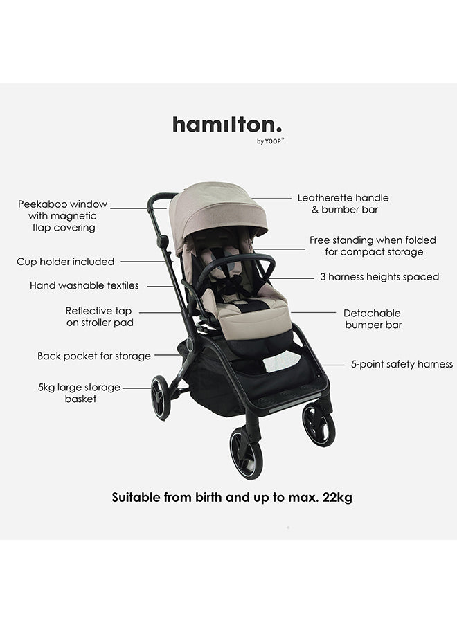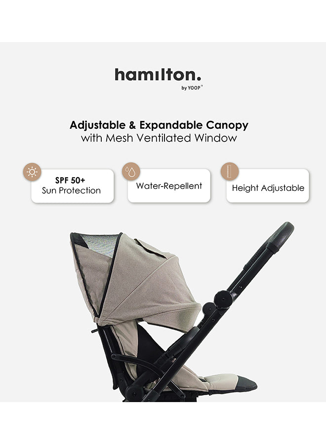 during outings and shopping trips. Easy to Use: Hamilton is one of the most lightweight, compact, full-feature stroller available with 360° Rotating Seat MagicFold Technology. Designed for every situation, every day, you can carry it anywhere with one hand. Stylish & Durable Build: Designed with a leatherette handle, detachable bumper bar, and hand-washable textiles, combining elegance and easy maintenance for long-term use. Practical Features for Everyday Use: Includes a peekaboo window with magnetic flap, reflective tap for safety, Large basket upto 5kg, Extended Sun Canopy with SFF 50+, ideal for city strolls, travel, and family adventures.