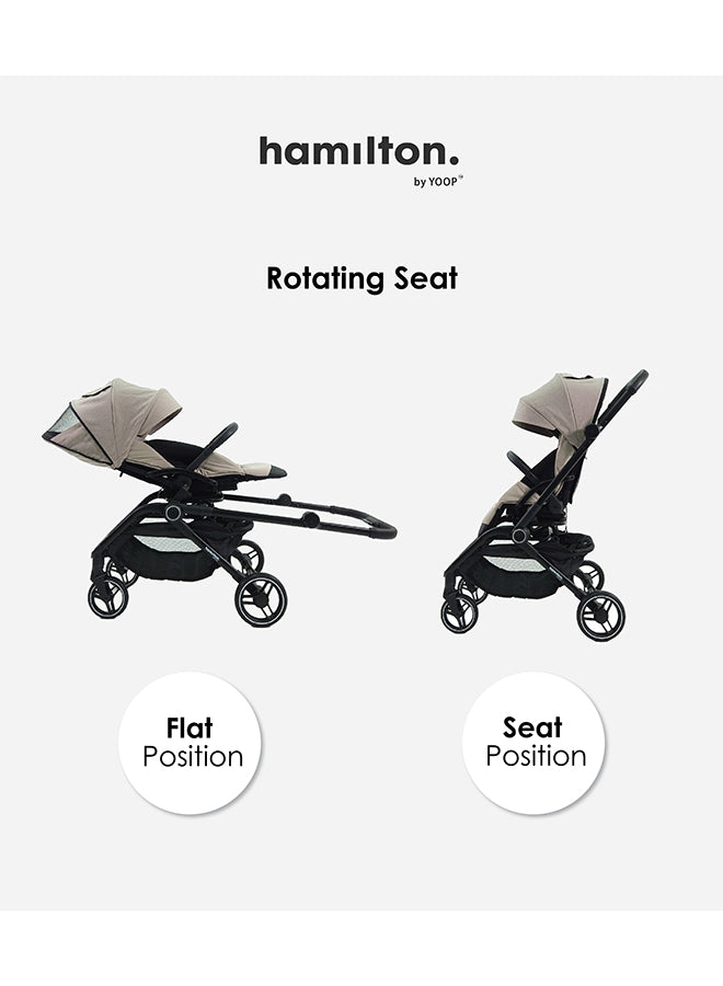 Hamilton T1 Lightweight Baby Travel Stroller MagicFold with 360° Seat Grey. MagicFold Mechanism Fold and Unfold with One-Hand, Compact Storage, Features a free-standing fold for compact, space-saving storage, perfect for busy parents and small car trunks. World's first 360° turnable seat in flat position. Comfort & Safety for Babies: Includes a 5-point safety harness, adjustable 3-height harness, and padded seat, ensuring a safe and cozy ride for newborns and toddlers up to 22kg. Parent-Friendly Design: Comes with a built-in cup holder, large 5kg storage basket, and back pocket for extra convenience