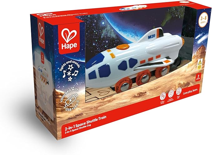 Hape 2-in-1 Space Shuttle Train with Light & Sound, USB charger included, For Endless Fun, 2 modes Space Shuttle & Train, Perfect addition to Hape's Mars Space Mission Trainsets, 3Y+