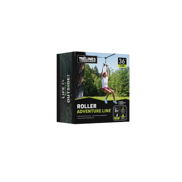 Hape 36 feet Roller Adventure Line, Zip Line Kit for Kids and Adult Up to 250 lbs, for Outdoor Backyard Playground Play, Easy to Install, Kit includes: 36’ line, Ninja Roller, New Treebar Branch, Bumper, carabiner, Ratchet Cover & storage bag, Ages 5yr+. The Roller Line is a thrill for 1 rider at a time to grab the tree branch shaped T-Bar and roll down the line between 2 trees of distance up to 30` (10M) apart. Similar to a simple Zipline but uses a 2" webbing material and heavy duty roller. Attach the starting point line up a little higher than ending tree and let the adventure begin!