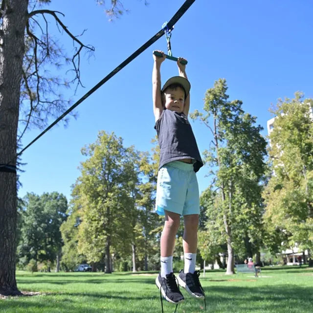 - EASY TO INSTALL IN MINUTES: This Roller Zip line offers great outdoor play and is easy to set up. Find 2 sturdy trees spaced 20` - 30` apart and attach the 2` webbing lines. Add the Roller wheel and Tree bar handle and let the adventure begin!