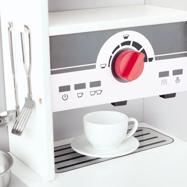 - INTERACTIVE ELEMENTS: Little chefs will love the realistic range hood with working lights, a microwave that makes a “ding” sound, and a coffee machine with cups to serve their friends. Each knob and dial clicks just like a real kitchen!