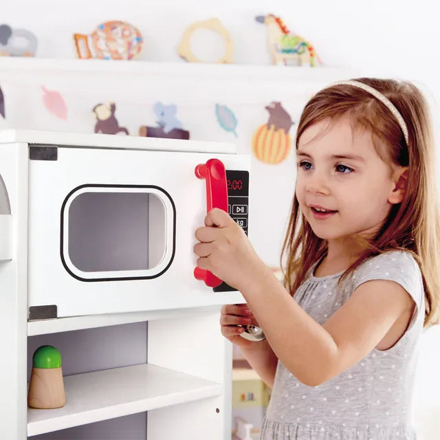 Children will love this multi-functional, All-in-1-Kitchen and its array of charming appliances and features, including a controllable range hood lamp and authentic microwave “ding”.
