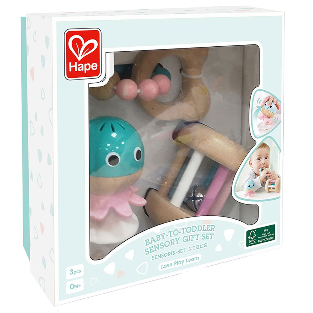 Hape Baby-to-Toddler Sensory Gift Set | Colorful Stay Put Rattle, Rolling Rattles and Teether | Sensory Play for Babies And Toddlers | Wooden, Multicolored