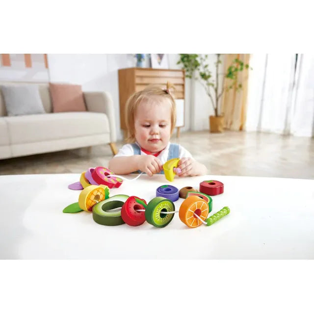 - INCLUDES 2 CATERPILLARS AND 13 FRUIT PIECES: Comes with two caterpillar strings and 13 colorful fruit pieces designed for lacing, threading, and imaginative play.