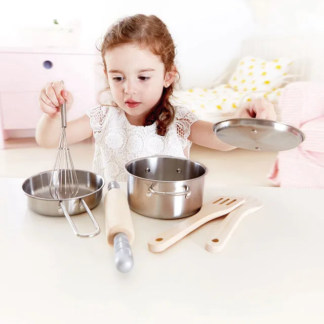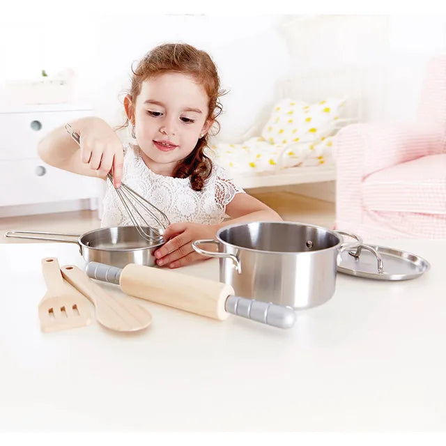 Hape Chef's Cooking Set - 7 Piece Wooden Pretend Play Kitchen Accessories for Kids - Pots, Pans, Utensils, and More - Encourage Imaginative Play, Creativity, and Role Playing for Toddlers and Children