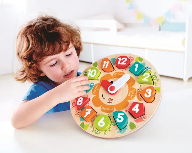 - LEARN TO TELL TIME WHILE HAVING FUN: The Hape Chunky Clock Puzzle offers a colorful and interactive way for kids to learn how a clock works, matching the colored pieces to complete the puzzle and understand time-telling concepts.