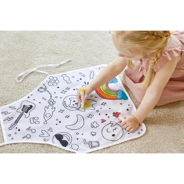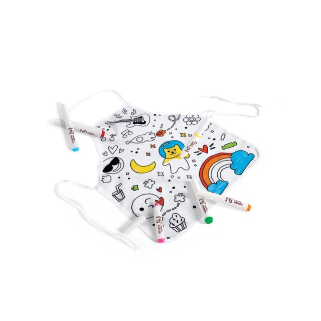 - COLOUR YOUR WAY: This apron comes with a set of six markers: green, red, yellow, orange, blue and black.