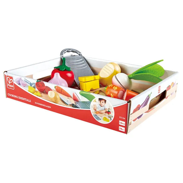 It’s time for dinner! Help to get things ready by trimming, peeling and chopping the vegetables and grating the cheese on your own cutting board. The separable ingredients and different tools come for extra realism.