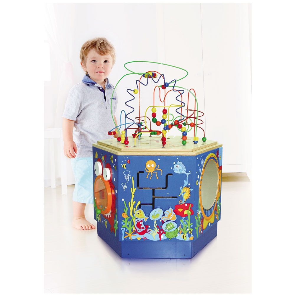 Magic of the ocean comes to life in the Coral Reef Activity Center. Levels, dials, gears, games, and mazes create an ocean of fun on this six-sided activity table. Activities include - a turtle maze challenge, a fish face with moving eyes, a marine animal matching game, a diving helmet mirror, an interactive moving knob activity. Multiple sides and activities let several children play at once. Beads help practice colour identification and counting.