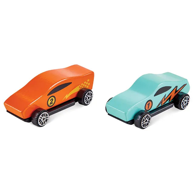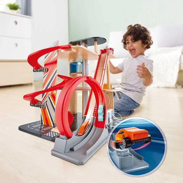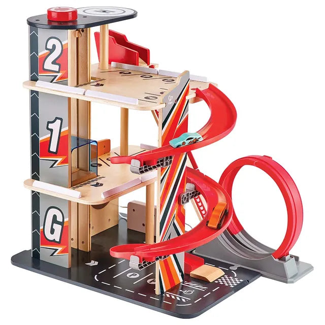 - THREE STORY WOODEN PLAYSET: Fast vehicles and supercars deserve only the coolest parking garage to park in. This three-level high-rise parking lot comes with a variety of creative functions and racing action for hours of play. Includes two free-wheeling cars to play with
