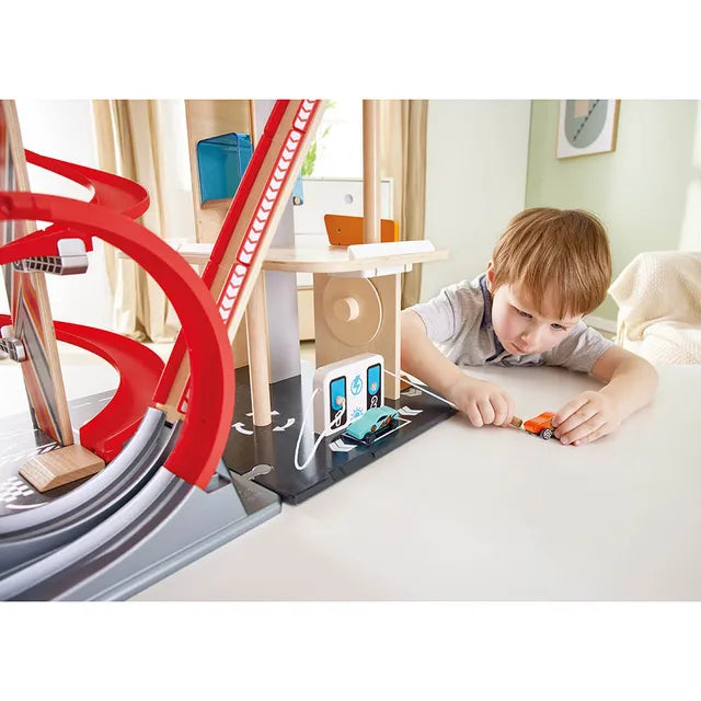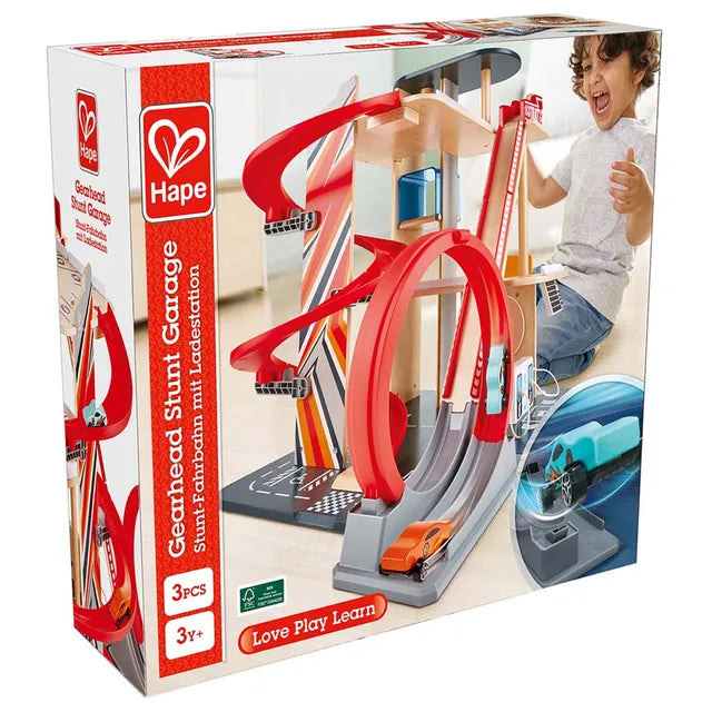 The Hape Gearhead Stunt Garage playset has a working elevator to transport your toy cars to the upper parking levels. From the top, it’s a race to the bottom with fantastic stunt ramp action. The set includes pretend charging ports to power your electric vehicles, a turning knob to choose the service needed at the service center, and two fast, free-wheeling toy cars to play with.