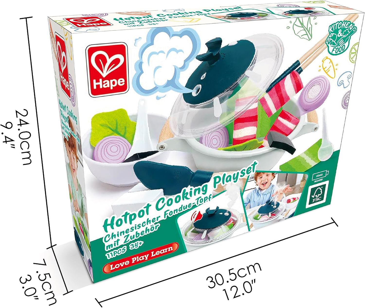 Hape Hotpot Cooking Playset - It’s time for dinner! This adorable and colorful hotpot cooking playset comes with a hotpot, chopsticks, play knife, spoon, and imitation fresh ingredients. It even bubbles and emits a cool mist just like real steam. It’s the perfect starter set for a hotpot dinner party!