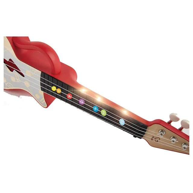 - TWO MODES WITH GUIDING LIGHTS: Kids can follow the fretboard lights to slowly strum a melody and master 6 different tunes in the Learning Mode. When your little rock stars build up their confidence, they can switch their ukulele to Band Mode to speed things up and play along with the accompaniments. It can also be played as a traditional ukulele if your little one feels like going unplugged!