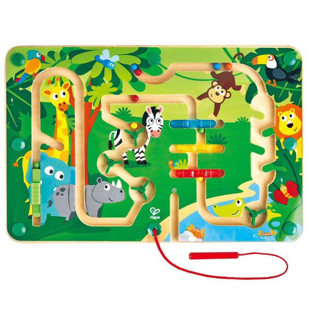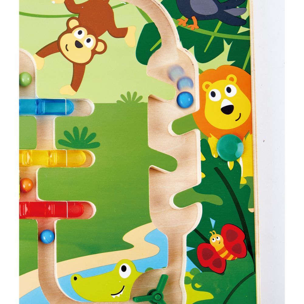 - WOODEN MAGNETIC JUNGLE MAZE: Play in the jungle and learn about its wild animals. Teach your toddler how to tilt the board or use the wand to guide the magnetic balls through the maze pathways, corners and revolving doors
