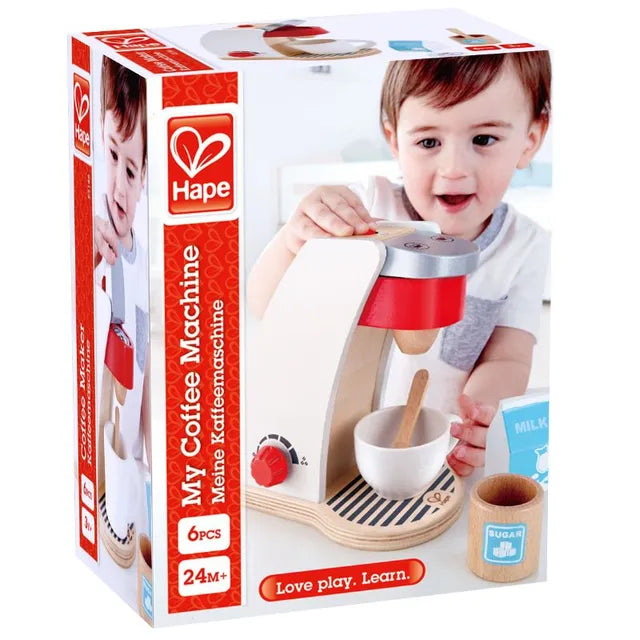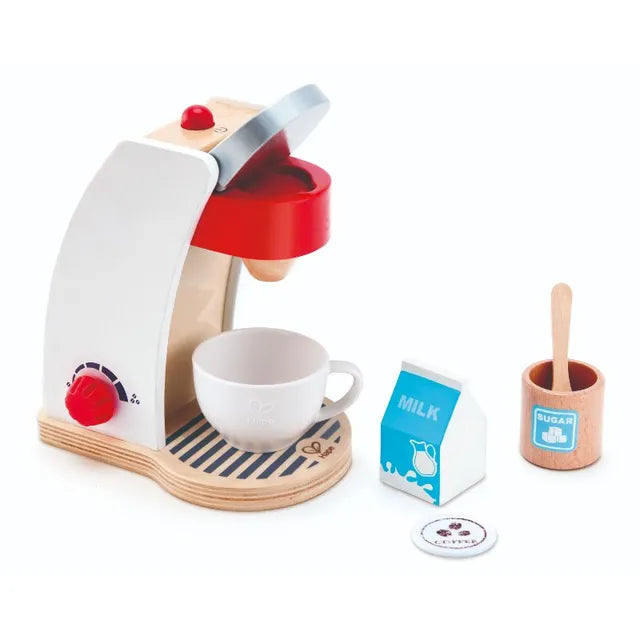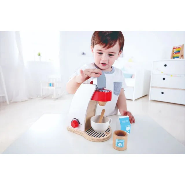 Hape My Coffee Machine – Wooden Pretend Play Kitchen Set for Toddlers, Includes Coffee Maker, Cup, Milk, Sugar Jar, Spoon, and Coffee Pod – Realistic Role Play Toy for Kids, Ages 2 and Up