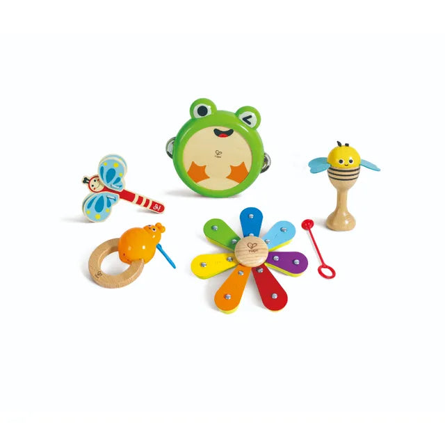 - FIVE INSTRUMENTS TO PLAY: This set includes a castanet butterfly, a bee maraca, a firefly bell, a flower xylophone and a frog tambourine.