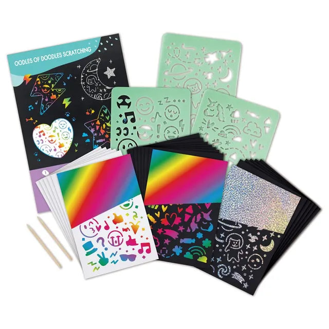 - WHAT'S INCLUDED: Perfect for little artists to learn more about doodling and art. Includes three sheets of fun thematic stencils, 20 scratching sheets with three types of color layers, two wooden styluses, and one poster