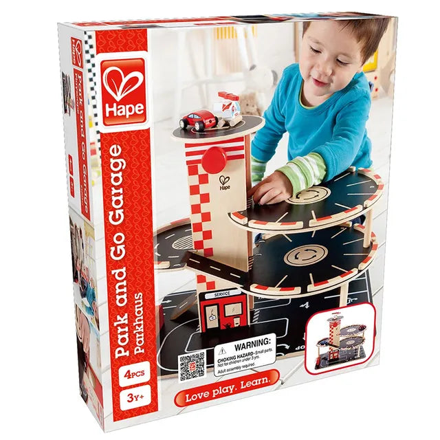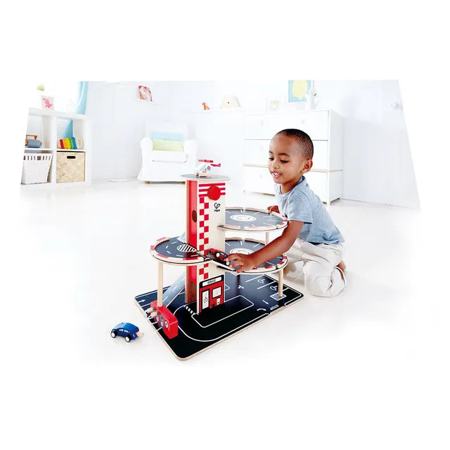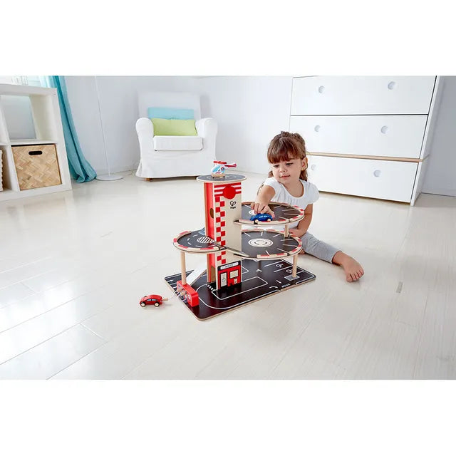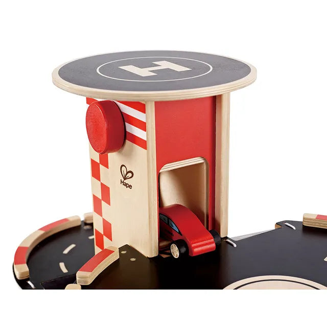 - MULTISTOREY DESIGN: This toy car garage has four levels of entertainment. It has multistorey parking, gas pumps for refuelling, a rooftop helicopter pad and an elevator for easy parking level access