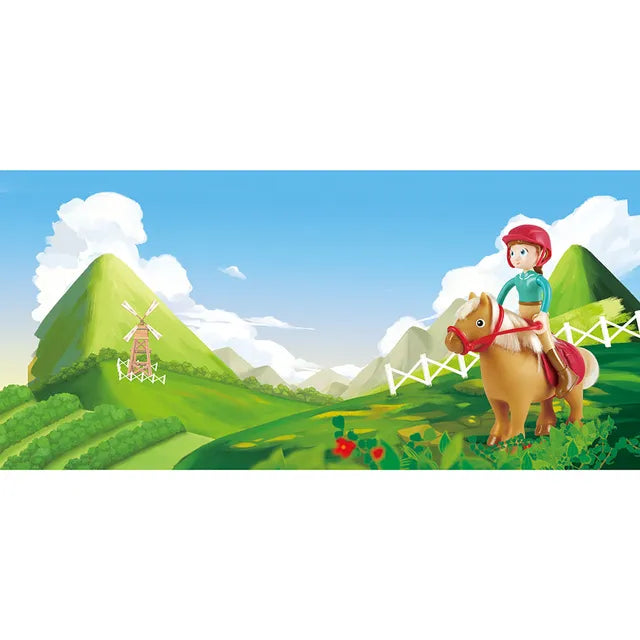 The pony horse ranch is a double story, four-room, complete home for rider and pony. When closed, it stores all the pieces, and the carry handle means your child can take it to play with friends or on holiday. Once open, the world of ponies and ranches comes alive. Included are a horse and rider, fully equipped stable, storage shed, barn and living room with a kitchen, that together create a stage-set for ranch life storytelling. Double-sided mats create outdoor areas, and the barn has a working pully to lift the hay bale. The pony ranch comes with fences, jumping obstacles, cleaning equipment, a ladder, and wheelbarrow. Your little one can take complete care of their pony, including grooming the pony’s hair!