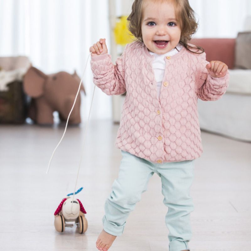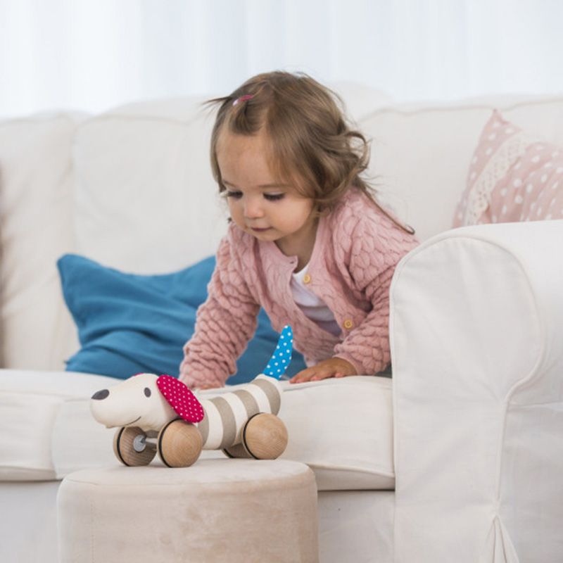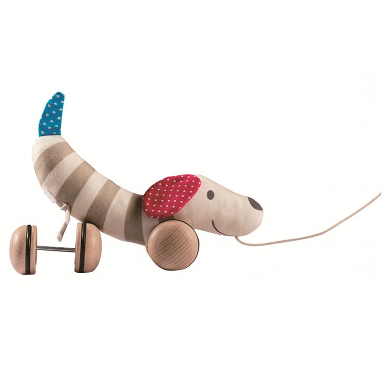 Take your adorable pull-along pup for a walk on his lead or cuddle up with him for a nap! His fun flappy ears are rotatable and when you've finished walking, you can easily remove his wheels and cuddle up with your soft fabric pal! The dog's wheels are made from smooth wood with rubber rims so your floors won't get scratched. Great for encouraging a love of animals and developing roleplaying skills.