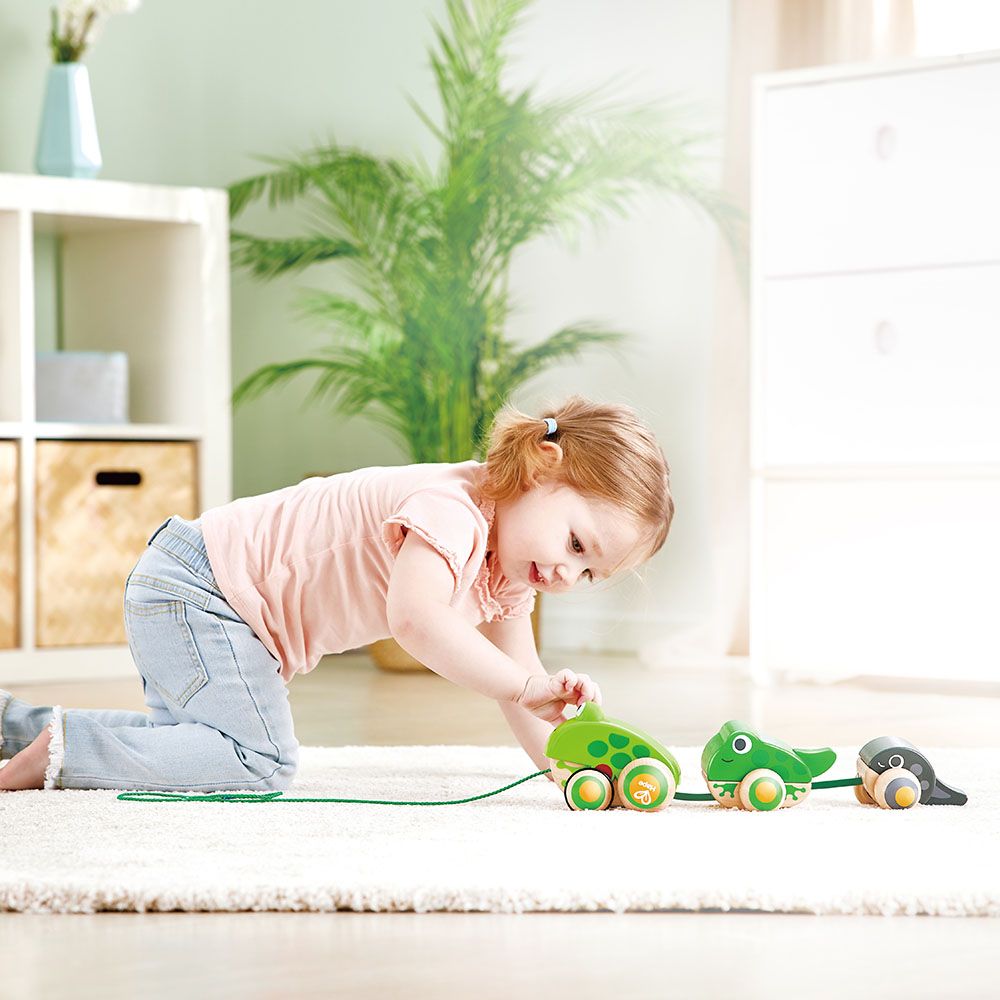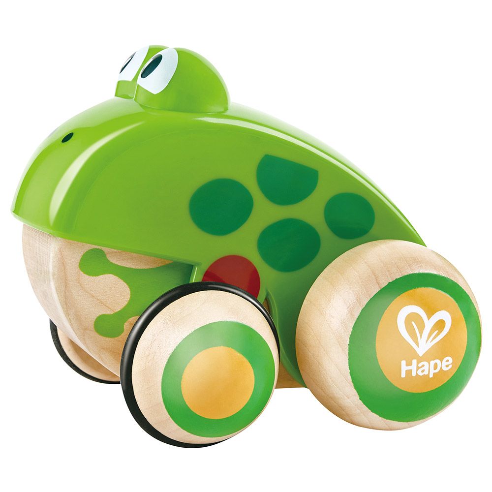 - SAFE TO PLAY WITH: Hape Pull-Along Family Frog is made from child-safe paint finishes and durable wooden materials, making it withstand many years of play. The wheels are rubber-rimmed and won't scratch the floor