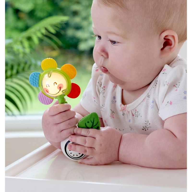A flower rattle that lights up when shaken - designed for grabbing, visual and fine motor skills development.