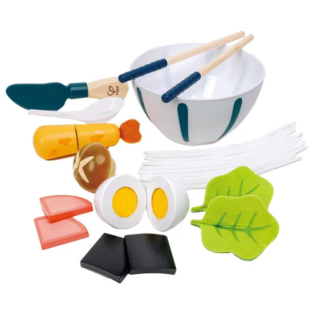 Hape “Slurp-Slurp” Udon Set - It’s time for dinner! This adorable and colorful udon noodle playset comes with a wooden bowl and chopsticks, knife, greens, noodles, eggs, mushrooms, shrimp and seaweed. It’s the perfect starter set for a noodle dinner party!