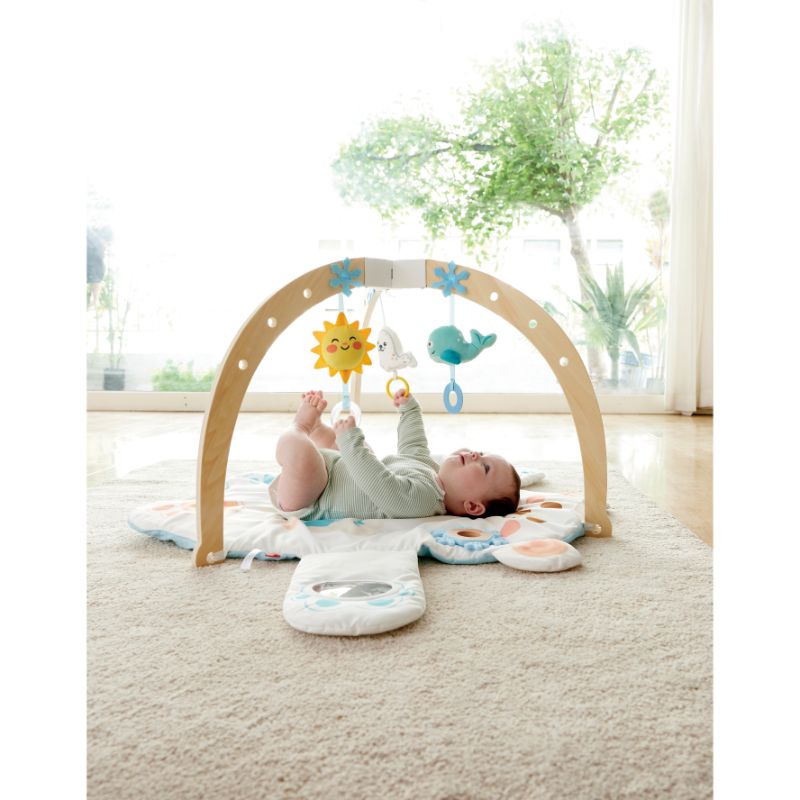 - COMPLETE PLAYSET: Includes 3 removable hanging activity toys (seal/whale/sun), 1 tummy pillow, 1 bear-themed mat, 1 snowflake teether, 1 double-sided card, and 1 wooden bracket.