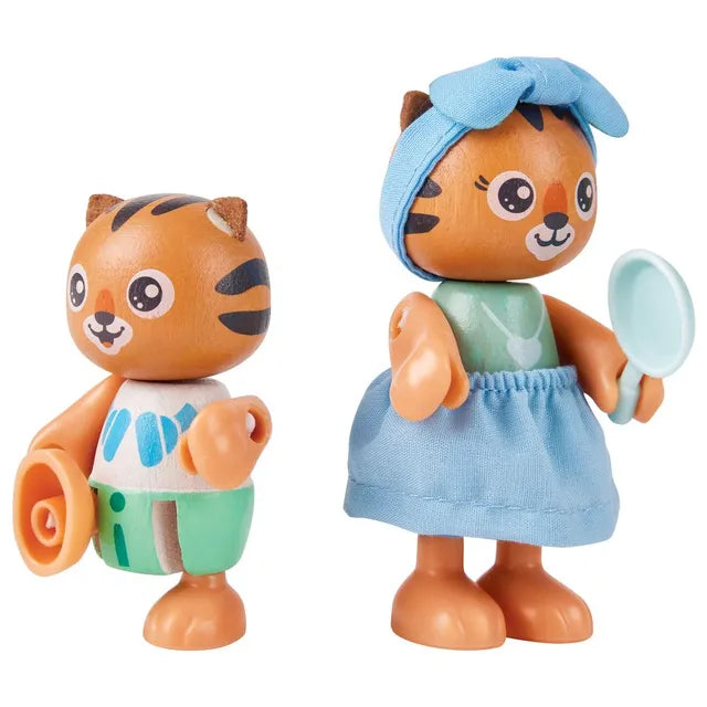 - TIGER DOLL HOUSE: Two-level wooden dollhouse play set for toddlers and preschoolers! Your child will love these little tigers, with all their accessories. There are two tigers in the set, and they can sit, stand, grip things with their hands and slide from the top level to a pond.