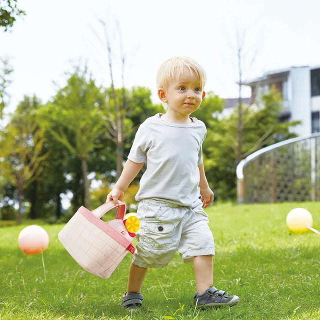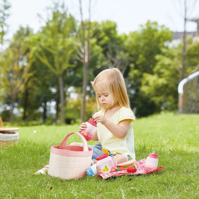 Hape Toddler Picnic Basket - Find your perfect spot then unpack your basket for a delicious picnic! Includes one fabric basket, one picnic cloth, three bottles of beverages, two strawberries and two pieces of bread, one lettuce leaf, one slice of tomato and one piece of cheese to make a sandwich with!
