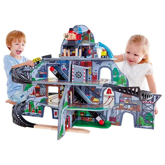 - WOODEN MOUNTAIN MINE: Drive your train from the surface of a mighty mountain into the busy mine operating deep inside! This fun playset includes a waterfall tunnel, an obstacle bridge, a crane, a conveyor belt and a repair station