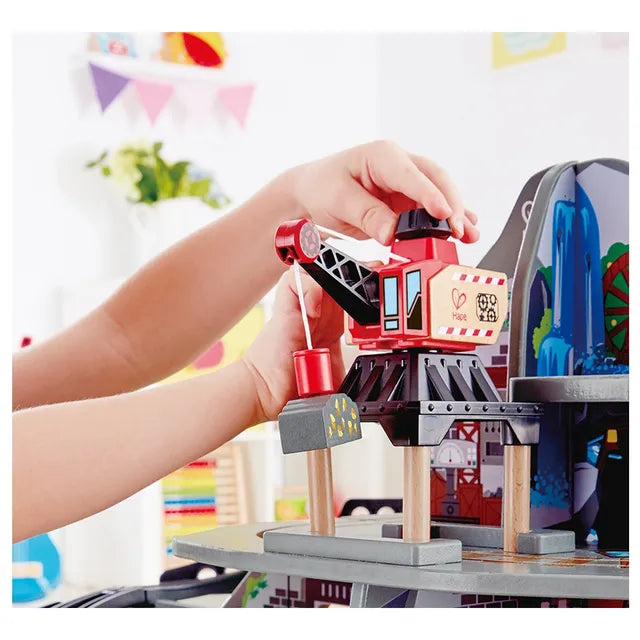 Mighty Mountain Mine By Hape - Navigate the rails in your train from the surface of a mighty mountain and travel deep into the busy operating mine! This multi-level playset is the ultimate wooden-railway experience and includes a waterfall tunnel, an obstacle bridge, a crane, a conveyor belt and a repair station.
