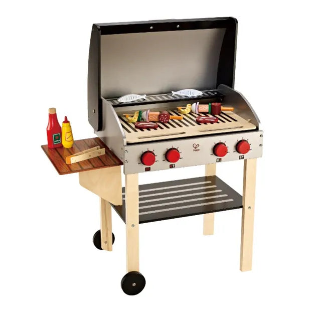 - BBQ GRILL PLAYSET: Give your aspiring grill master the excitement of making a BBQ! With double-sided grates, a collapsible side table, moveable wheels and an open-and-close hood, this grill set is a mini-chef’s dream