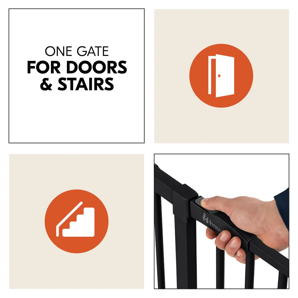 - Expandable: with separate extensions (9 or 21 cm per side), the child safety door can be extended for wider openings; for round stair railings, the hauck Y-spindle is required