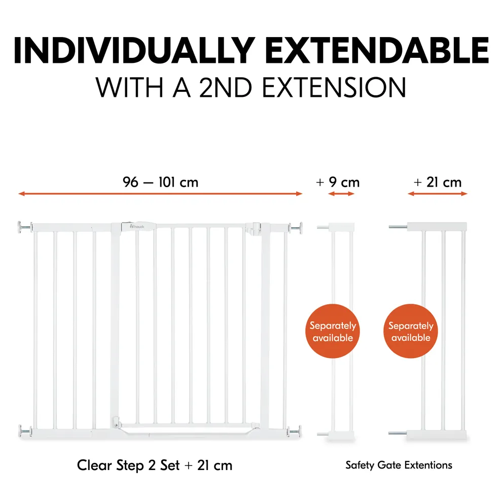 - Expandable with separate accessories: with hauck extensions of 9 cm/21 cm (max. 2 pieces, one per side), the baby gate can be widened; for round railings, the hauck Y-spindle is required